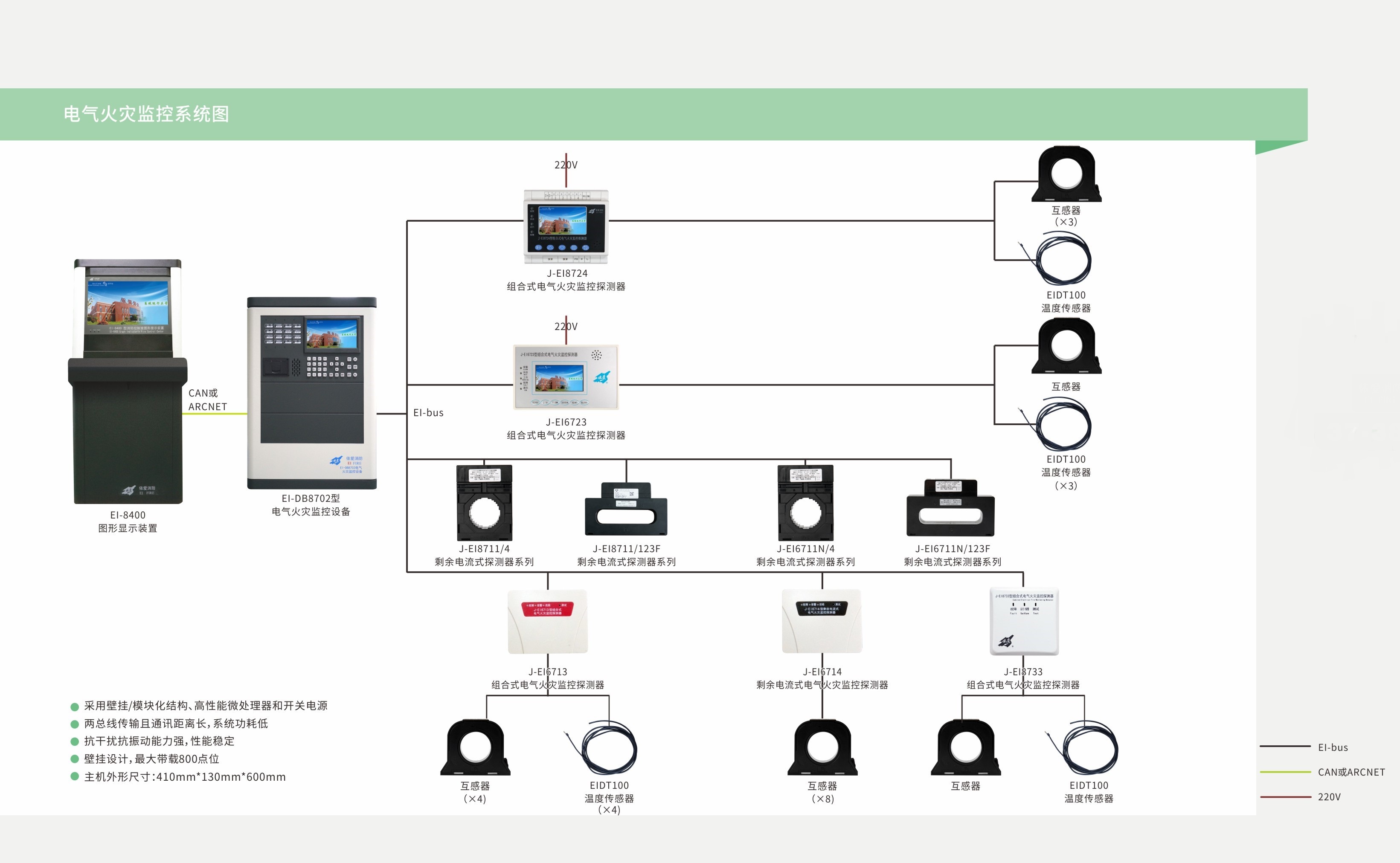 EI 系列電氣火災(zāi)監(jiān)控系統(tǒng)應(yīng)包括電氣火災(zāi)監(jiān)控設(shè)備、剩余電流探測器(電流互感器)、測溫式探測器(傳感器)等產(chǎn)品。