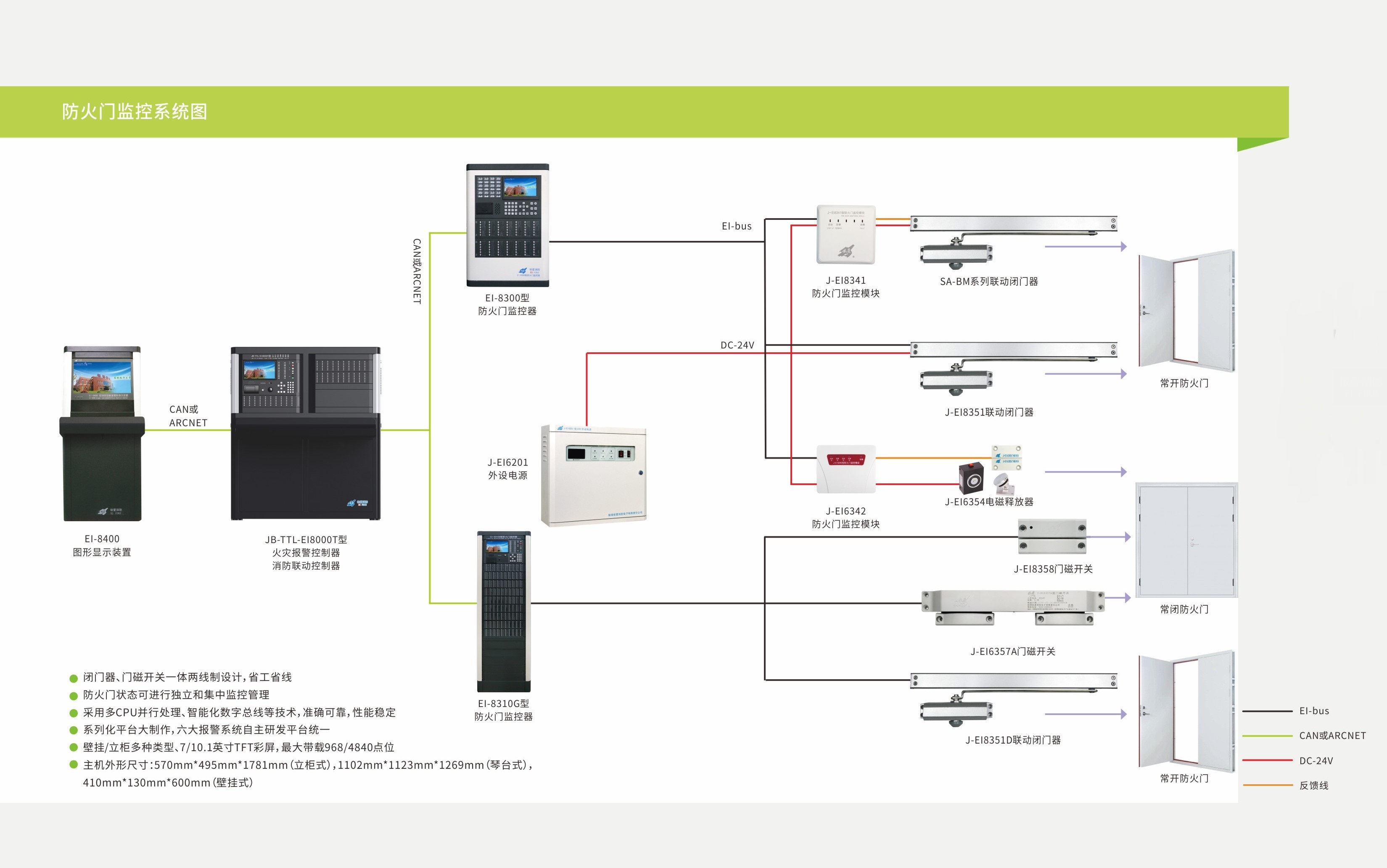 通過監(jiān)控模塊,配接聯(lián)動閉門器、電磁釋放器、門磁開關(guān),實現(xiàn)對各類常開、常閉門的控制和狀態(tài)監(jiān)視;
